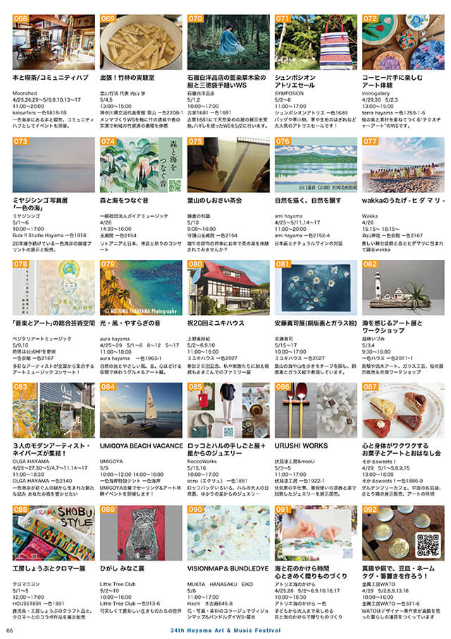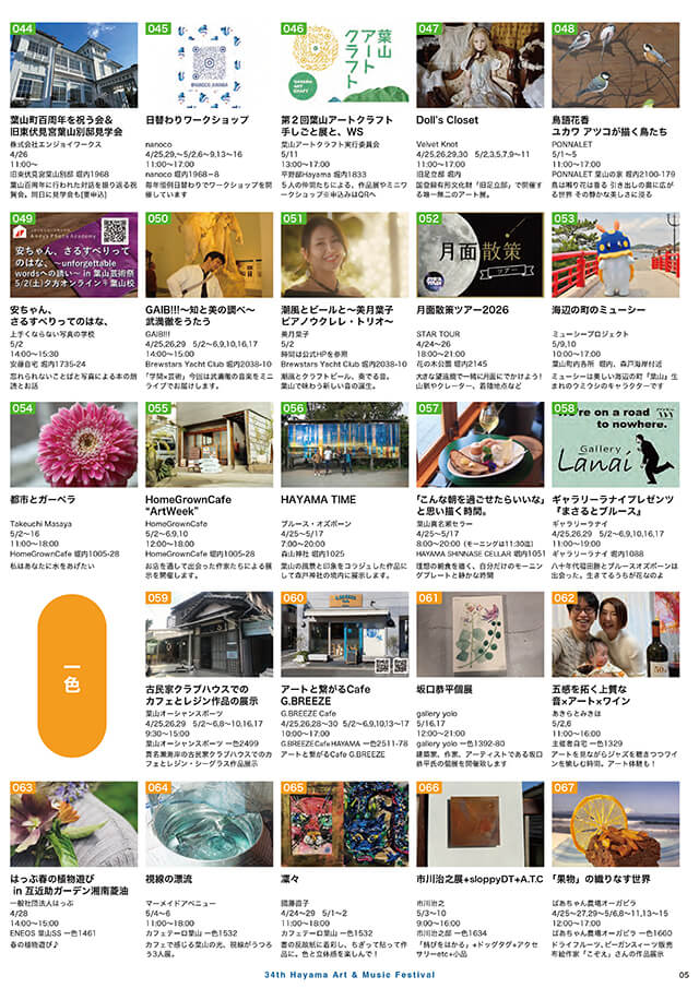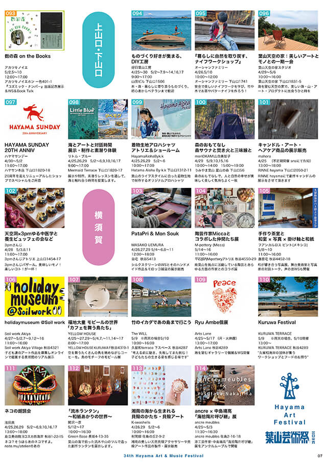 葉山芸術祭は、神奈川県三浦郡葉山町を中心に相模湾沿岸に広がる湘南地域で生活するアーティストの参加により、毎年ゴールデンウィークを中心に4月中旬から5月中旬に開催するアートフェスティバルです。