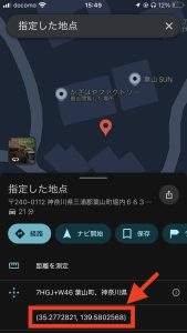 • この方法ではすでにGoogleマップに登録済みでラベルのついている場所の座標を取得することができません。パソコンでならその地点の座標が取得可能なのでパソコンで取得するか、少しだけずらしたラベルのついていない場所を長押しして指定してください。